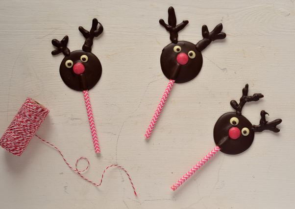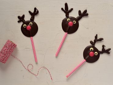 2. Sütőpapírral letakart tálcára egy szűk evőkanálnyit adagolunk a csokoládéból, a tálcát óvatosan a munkapulthoz ütögetjük, hogy szépen terüljön. A csokoládé-korongba óvatosan beleillesztjük a nyalókapálcát vagy méretre vágott szívószálat, és elforgatjuk, hogy teljesen befedje a csokoládé. Egy szem piros cukordrazsét helyezünk a szívószál fölé - ez lesz a rénszarvas orra. Ezt megismételjük, míg a csokoládénk kb. háromnegyede el nem fogy. Vigyázat, hagyjunk majd helyet a sütőpapíron a rénszarvasok agancsának is!