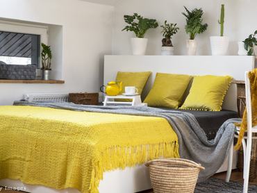 „A régi kanapét teljesen megújíthatjuk egy színes takaróval, vagy aki ügyesebb, varrhat rá huzatot is. A franciaágyra is választhatunk egy divatos ágytakarót, de elég lehet egy szép ágyneműhuzat és egy színben harmonizáló pléd, amelyet az ágy végébe helyezünk. Egy új függöny, mivel nagy felületet fed le, rengeteget változtat a lakás hangulatán, ugyanakkor ez már nagyobb költség lehet. Ám ezekkel a textíliákkal behozhatjuk a kedvenc színeinket a lakásba, és otthonossá tehetjük a bérleményt” – mondja Müller Mónika.