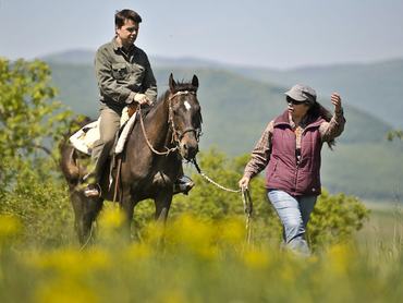 Ekkorra már ki is választotta, hogy melyik lóval fogunk pár gyakorlatot elvégezni. Elindultunk a göröngyös fennsíkon egy kissé félreeső tisztás felé. Mivel nekem csak arra kellett figyelnem, hogy azon az oldalán haladjak a lónak, ami nem zavarja őt, volt időm kérdezősködni. Kiderült, hogy egyre többen vannak azok, akik Baracsy Gabi potenciális páciensei lehetnének, mert egyre több - a beszédzavaros, diszlexiás mellett - a magatartás- és viselkedészavaros gyerek is.