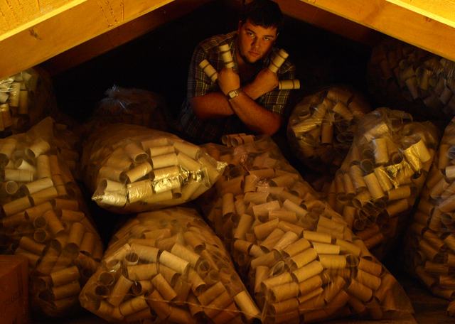 „Negyedikes voltam, amikor egy osztálytársnőm mondta, hogy az öccse kidobott kétszáz darab vécépapír-gurigát. Akkor jött az isteni szikra, hogy ezeket akár én is gyűjthetném. Az elején azt hittem, hogy nehéz lesz ezer darabot gyűjteni, de ez gyorsan meglett, úgyhogy úgy gondoltam, majd tízezernél megállok. Aztán tíz év alatt összejött ez is, és mivel mindig érkezik szállítmány, és én is gyűjtögetem, rájöttem, hogy gyűjtögetem, ameddig tudom” – avatta be a Díványt fura szenvedélyébe Csontos, akinek a gurigái egy egész padlásnyi helyet elfoglalnak. „Zsákokban vannak szortírozva, egy zsákba háromszáz darab fér.”