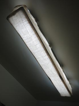 A következő tipphez kell egy kis kézügyesség, vagy egy varrónő, de ígérem, megéri a fáradozást. Akinek van a lakásában neonlámpa, az pontosan tudja, milyen rettenetes a fénye: olyan, mintha az ember egy általános iskolai osztálytremben élné az életét. Egy ilyet lecserélni azonban nem egyszerű: tuti, hogy szerelő kell hozzá, majd venni kell egy drága csillárt, valahogyan felapplikálni, végül pedig eltakarni a neonlámpát tartó csavarok okozta lukakat. Ennél milliószor egyszerűbb, ha lemérjük a lámpatestet hosszában-keresztben-mélységében, és varr(at)unk neki egy „ruhácskát”. Én pár méter sima, fehér vásznat, és lenvásznat vásároltam, és a „lámpahuzatra” minden oldalon varrattam egy-egy szalagot, amelyekkel felkötözhettem a lámpadobozra. A két réteg pont úgy szűri meg a fényt, hogy meleg, ragyogó fényt varázsol a neon rideg fehérjéből, és eltakarja a műanyag lámpatestet.