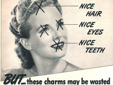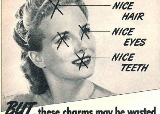 A nőket hülyének és szerencsétlennek beállító hirdetések közül általában azok a legnyomasztóbbak és legdurvábbak, amik a nők illatára mennek rá. Itt van például ez a reklám, amin kipipálják, hogy oké, szép haja van, szép szeme van, a fogai is rendben, de mindez mit sem ér, ha nem a megfelelő illatot használja. Az sajnos nem derül ki, hogy pontosan milyen illatot hirdettek ezzel a reklámmal, de ha még ma is létezik a márka, most már talán hálásak is érte a reklámügynökségüknél, hogy ez titokban maradt.