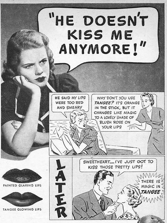 Egy fiatal lány összetörve panaszkodik, hogy barátja már nem akarja többet megcsókolni, mert az ajkán a rúzs túlságosan vörös és összecsomósodik. Erre a barátnője azt javasolja neki, hogy használjon Tangee-t, ami nemcsak színváltós (emlékszik még valaki a Mystic rúzsra?), de selymesen sima, telt ajkakat is varázsol. Az utolsó kockán be is jelentkezik a férfi egy csókért, a nő pedig boldogan nyugtázhatja, hogy igen, annyit ér, amilyen a rúzsa.