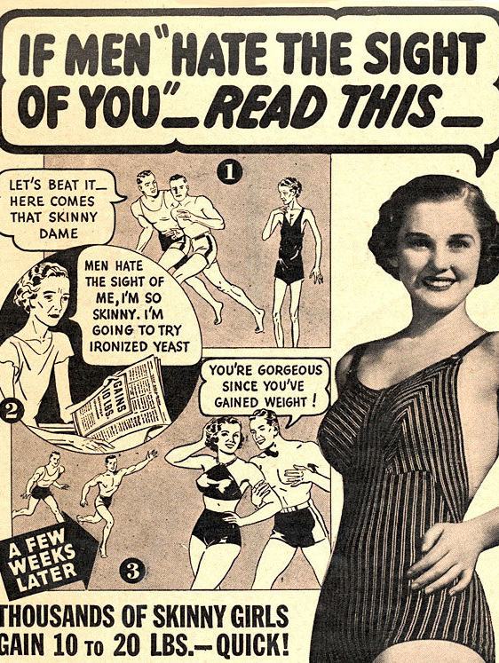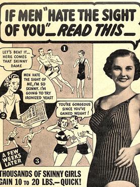 "Ha a férfiak ránézni se bírnak önre, olvassa el ezt" - utasít a reklám, ami arra biztatja a nőket, hogy szedjenek fel néhány kilót. "Lépjünk, jön a piszkafa" - menekülnek az első képen a férfiak. "Csont és bőr vagyok, a férfiak gyűlölik a látványomat is. Kipróbálom az extra vastartalmú élesztőt" - marcangolja magát a nő, aki szerencséjére egy újságban rálel a megoldásra. "Csodás vagy, mióta felszedtél pár kilót!" - udvarolják aztán körbe őt a harmadik képen a hímek, az élete tehát bizonyára egy csapásra megoldódott.