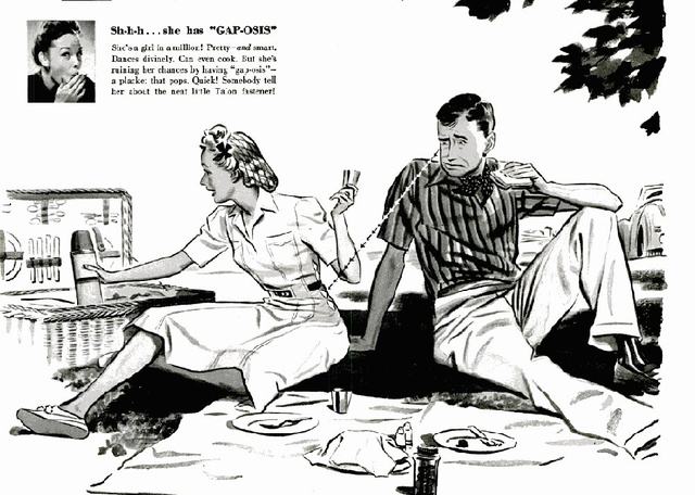 "Ilyen apróságok is bosszanthatnak egy férfit" - olvasható a hirdetésben. "Ő a tökéletes nő. Csinos és okos. Remekül táncol. Még főzni is tud. De mindent elront, hogy a kapcsoknál szétfeszül a ruhája! Gyorsan, valaki ismertesse meg vele a cipzárt!" - írják. Hát igen, hiába a csodás piknik, a szendvics, a tánctudás, egy férfi sem fogja elnézni azt a bűnös hanyagságot, ha barátnője nem kellően korszerű zármegoldással látja el a ruháját, szégyellje is magát az ilyen.
