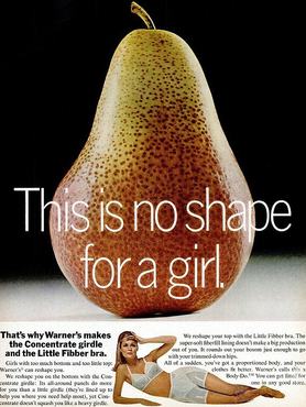 "Ilyen alakja nem lehet egy nőnek" - jelenti ki szemrehányóan a reklámszöveg az (amúgy gusztusos) körtére írva. "Ezért alkotta meg a Warner a Concentrate fűzőt és a Kis Cseles melltartót" - írják alatta vastagon szedett betűkkel. "Lányok, akiknek túl nagy feneketek van és túl keskeny vállatok, a Warner segíthet nektek átszabni az alakotokat!" A fehérneműk tehát, ahol elvileg kell, összefogják a nőket, ahol kell, kikerekítik. Hadd nézzenek már ki rendes emberhez méltóan.