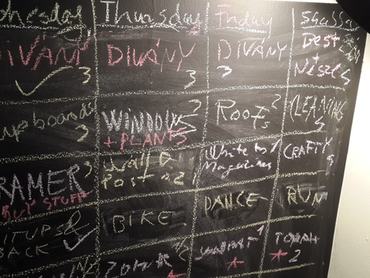 Ha elvégeztem egy küldetést, egyszerűen kipipálom az adott feladatot. Ha viszont egy nap végére nem sikerült teljesítenem egy-egy betervezett feladatot, nem borulok ki, egyszerűen átteszem egy másik, kevésbé sűrű rapra, a kréta ugyanis könnyedén letörölhető a táblafestékről. Eltart egy-két hétig, míg az ember megtanulja a maga tempóját, és kitapasztalja, hogy hányféle „órát” képes végigcsinálni egy nap alatt. Én ezen a héten már azt is odaírtam a kis boxok csücskébe, hogy előreláthatólag mennyi időt visz majd el egy-egy tevékenység, így nem esem abba a hibába, hogy harminchatórás napokat tervezek be magamnak.