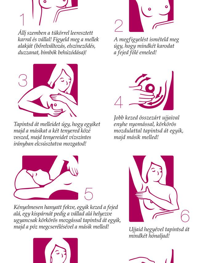 Évente 7000 nőnél diagnosztizálnak mellrákot Magyarországon, és ebből 2000 eset végződik halállal a késői felismerés miatt. A nők 40 százaléka jár csak szűrésre, pedig a havi, rendszeresen végzett önvizsgálat akár életeket is menthet - olvasható Mellrákfórum közleményében. Azt már sokszor elmondták, hogyan kell szakszerűen végezni a mellvizsgálatot saját kezűleg. A hajtás után viszont olyan ábrát talál, amely meg is mutatja, hogyan tudja megfelelően és szakszerűen elvégezni a mindössze ötperces vizsgálatot.