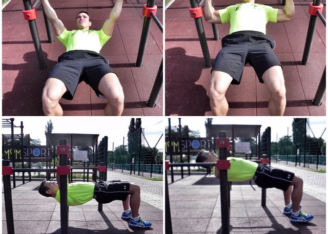 Köznapi neve fordított fekvőtámasz. Az egyik legjobb gyakorlat a felsőtest erősítésére, akár a kezdőknek is. Keressen egy alacsonyan lévő rudat - erre a legtökéletesebb a szabadtéri kondipark, de bármelyik játszótéren talál hasonlót. A törzs legyen egyenes, támaszkodjon a sarkán és fogja meg a rudat vállszélességnél szélesebben úgy, hogy a rúd pont a mellkasnál legyen. Innen egyenes törzzsel húzza a mellkasát a rúd felé úgy, hogy a lapockákat közelítse egymáshoz, a mellét kissé nyomja előre, a vállait pedig feszítse hátra. Itt tartsa meg 1-2 másodpercig a mozdulatot, majd nagyon lassan engedje vissza.
