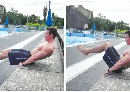 Üljon le egy pad végére hátradöntött felsőtesttel, egyenes háttal. Emelje meg a lábát, a térdét enyhén hajlítsa meg. Egyszerre emelje a felsőtestét lába felé és húzza a lábat a mellkas felé, majd vissza.