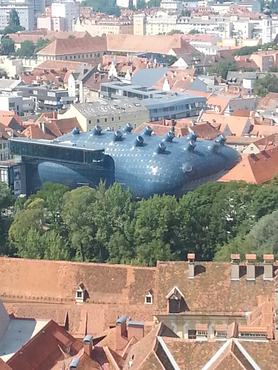 A barátságos idegen névre keresztelt Kunsthaust Peter Cook és Colin Fournier tervezte, akik angolok A békaszerű képződmény körbeveszi a régi épületeket, mégsem zavaró a modernitása. Hangulatos hely egy fantasztikus kávézóval, ami elé zöldségeket ültettek dekoráció gyanánt. Érdemes ha nincs jó idő egy 24 órás jegyet venni, ami a Kunsthaus mellett több más múzeumba is jó. ez gyerekeknek 4 euró, felnőtteknek 10.
