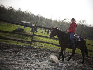Különleges élmény így lovagolni és elképesztő koncentrációt igényel. Miközben én a körkarában próbálkozom, a régi motorosok – tizenöten – a ranch pályáján gyakorolnak, a kurzuson ugyanis két hónapos önálló munka után kell megmutatniuk Halápi Rolandnak, hogyan fejlődik kommunikációjuk lovukkal. A kurzus délutáni szakaszában egy rövidített ügyességi pályán kell végigmenniük a ló-lovas párosoknak, a ranch vezetője pedig megnézi, kinek min kell még javítania, merre kéne tovább fejlődnie. A pályán találunk vizesárkot, amibe bele kell állni, pallót, amin végig kell menni lóval, hordókat, amik között el kell lavírozni. A feladatok életszerűek, hasznosak, a lovasoknak úgy tűnik, nem okoznak gondot: egymás után állnak bele lovukkal a sekély vízbe vagy trappolnak át a fapallókon. Az egész egyben egy játékos verseny is, aki jó idővel végez a pályán, Wellensteyn kabátot kap – a márka a lovarda támogatója évek óta, és jól működik a kapcsolat, meleg kabátok nélkül elég nagy bajban lennének a lovasok a téli edzéseken. Utóbbiról én is meggyőzödhetek a kis piros Wellensteyn kabátban, amit a lovaglás idejére kölcsön kapok.