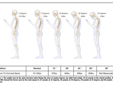 Egy felnőtt ember fejtömege 4-6 kg, vagyis egyenes testtartás során ekkora súly nehezedik a nyakcsigolyákra. (A súlypont a hetedik nyakcsigolya fölött nagyjából 16 cm-re található.) New York-i orvoskutatók egy életnagyságú modellen kísérletezve állapították meg, hogy helytelen, előrebillentett fejtartás közben hogyan változik ez az arány: a fej mindössze 15 fokos dőlésszöge során a tömeg megduplázódik, 30 foknál 18 kg, 45 foknál 22 kg súly nehezedik a gerincünkre, 60 fokos fejbiccentéssel pedig akár 27 kilóval is terhelhetjük a nyaki gerincszakaszt, ami leggyakrabban akkor fordul elő, amikor ülő helyzetben az ölünkben tartott készülékünkkel babrálunk. Természetesen ehhez hasonló a fejtartás könyvolvasás során is, de ma már sokkal jellemzőbb az okostelefonok vagy tabletek fölött görnyedni, mint könyvet lapozgatni utazás vagy várakozás közben.