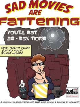 De ha dr. Brian Wansinkre hallgat, akkor marad a tényleg nagyon egészséges ételeknél, ugyanis egy szomorú film alatt bármiből több fogy, így szerinte ez tökéletes alkalom arra, hogy rákapjunk a kevésbé hizlaló, de esetleg eddig mellőzött ételek ízére. A Cornell Egyetem kutatói korábban azt is kiderítették, hogy az akció- és kalandfilmek is arra ösztönöznek, hogy többet együnk. Persze nem azért, hogy megnyugtassuk a lelkünket, egyszerűen csak tartani akarjuk az iramot.