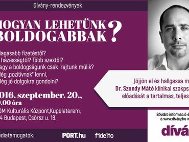 Ha pedig ennél is többet szeretne tenni a boldogabb, teljesebb életért, jöjjön el szeptemberben előadássorozatunk első alkalmára, és hallgassa meg, mit mond a boldogságról dr. Szondy Máté klinikai szakpszichológus. Sok hely már nincs, de talán önnek még akad: itt regisztrálhat.