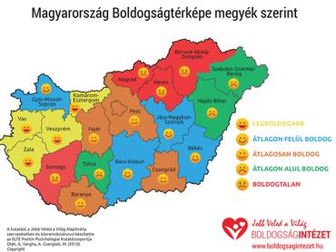 A felmérésből kiderült, hogy az ország gazdagabb régióiban boldogabbak az emberek, azon belül is a Közép-Dunántúl a legboldogabb régió az országban. A legkevesebb boldogság Észak-Magyarországnak és a Dél-Dunántúlnak jut, megyei bontásban pedig Nógrád, Heves, Borsod-Abaúj-Zemplén és Somogy lakossága szomorkodik a leginkább. A legboldogabb magyar emberek Vas, Zala Veszprém és Komárom-Esztergom megyékben élnek. Városi bontásban egyébként a boldogságlistán Győr vezet, míg Miskolcon a legboldogtalanabb a nép. Mondjuk az, hogy a megyeszékhelyek közül vajon miért Tatabányán vallják magukat a legtöbben boldognak, nem derül ki egyértelműen a kutatásból.