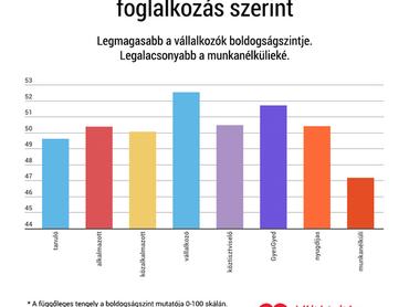Hiába tudjuk a világ legrégebb óta tartó boldogságkutatásának eredményeiből, hogy nem a pénz, hanem a jó kapcsolatok azok, amik boldoggá és egészségessé tesznek minket, a hazai adatokból úgy látszik, a boldogság szoros együttjárást mutat a magasabb vagyoni helyzettel. Minél gazdagabbnak vallotta magát ugyanis egy résztvevő, nagy valószínűséggel annál boldogabbnak is érezte magát. A nemzetközi és hazai adatok közötti ellentmondásnak valószínűleg az az oka, hogy a folyamatos pénzügyi gondok, a bizonytalanság negatívan hatnak a jóllétünkre, és a pénz szerepe csak egy bizonyos anyagi biztonság felett veszíti el a boldogságunkra gyakorolt jelentőségét. Bár a bizonytalanság általában nem segít azon, hogy jobban legyünk a bőrünkben, Magyarországon mégis a vállalkozók vallották magukat a legboldogabbnak, őket követik a gyesen és gyeden lévők. A foglalkozást tekintve a legalacsonyabb boldogságszint a munkanélkülieknek jutott.