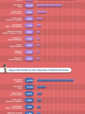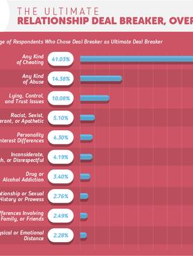 Az alkalmazás felhasználóinak válaszaiból kiderült, hogy az, amit az emberek a legkevésbé bírnak elviselni a hűtlenség. Legalábbis a válaszadók 43 százaléka erre voksolt, ezt követte 14 százalékkal a bántalmazás, ami azért elég megdöbbentő adat. Ez egyébként nem csak azt szemlélteti, hogy mennyire alulértékelt a kapcsolaton belüli bántalmazás, hanem azt is, hogy nagyon sokan élnek és bennmaradtak egy ilyen kapcsolatban. Általános szakítási okok között a hazudozás, a bizalmi okok is szerepeltek, és a szexizmus, rasszizmus is képviselték magukat, bár elég alacsony százalékban. Nezze csak, így néz ez ki egy összesített táblázatban: