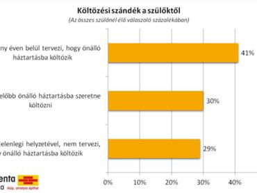 A kutatás eredményei alapján a szülőkkel lakók 29 százaléka elégedett a jelenlegi helyzetével, a többiek viszont költözni szeretnének előbb-utóbb. A legtöbben (41%) néhány év múlva, majdnem harmaduk pedig (30%) minél hamarabb saját háztartást szeretne. A költözési szándékot természetesen jelentősen befolyásolja az életkor: a harmincasok azok, akikben a legerősebb a változás vágya. 46 százalékuk említette, hogy a lehető leghamarabb önálló háztartásba költözne, a húszasoknak mindössze 28 százaléka szeretne gyorsan változtatni a helyzetén. Az életkor mellett a párkapcsolat és a családtervezés közelsége meghatározó: főként azok nagyon költözéspártiak, akik párkapcsolatban élnek, valamint gyereket terveznek.
