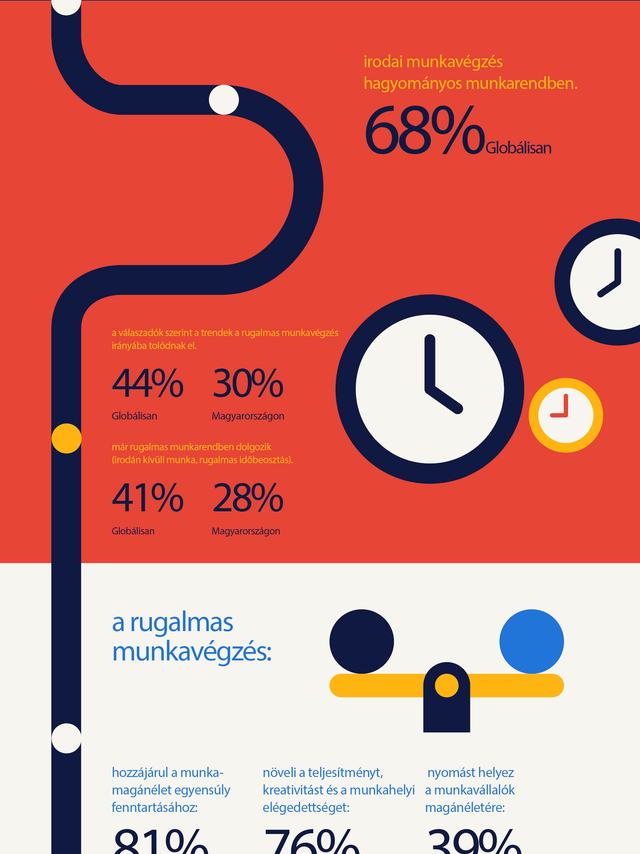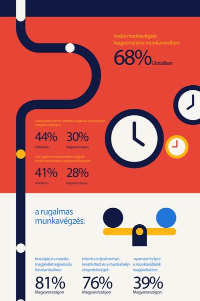 Világszerte még mindig hagyományos munkarendben, irodában dolgozik a munkavállalók 68 százaléka. A Randstad Workmonitor felmérése szerint ugyanakkor a munkavállalók 44 százaléka nyilatkozott úgy, hogy kezdenek elterjedni a rugalmas lehetőségek mind a munkavégzés helyét, mind az időbeosztást tekintve. Világviszonylatban India és Kína járnak az élen, amihez minden bizonnyal jelentősen hozzájárulnak a nagy földrajzi távolságok.