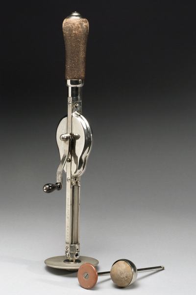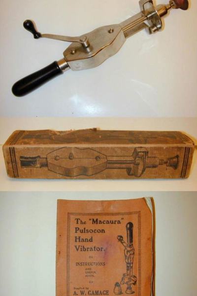 A Macaura’s Pulsocon Hand Vibrator elnevezésű valami már egy könnyebben kezelhető vibrációs eszköz volt, bár küllemre még inkább inkvizíciós eszközre, vagy a nagyid konyhájában heverő kézi habverőre emlékeztet. De hiba volna elnézően mosolyognunk a készülék láttán, mert a kézi vezérlésű eszközből percenként akár 5000 rezdület is kicsikarható volt. Igaz, csak nagyon áldozatos munkával… Az egyik kezet az eszköz megfelelő helyre illesztése és ott-tartása, a másikat pedig az erőteljes kurblizás kötötte le.