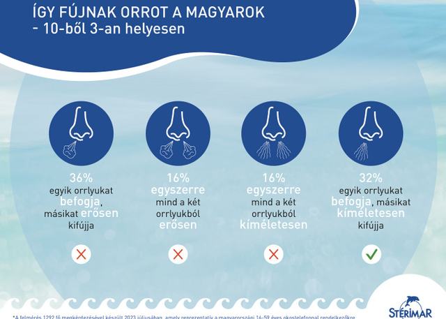 A Sterimar friss kutatási eredményei alapján a magyarok 68%-a nem megfelelően fúj orrot, ami azért probléma, mert a helyes orrfújással akár betegségeket is megelőzhetünk, ha pedig esetleg már megbetegedtünk, akkor lerövidíthetjük azok időtartamát. Ami valljuk be, dübörgő náthaszezonban egyáltalán nem hátrány, sőt.