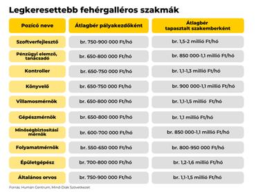 A munkáltatók által legkeresettebb fehérgalléros szakmák és az ezekhez tartozó (prémium, jutalom, külön juttatás nélküli) fizetések az alábbiak szerint alakulnak. Itt már nem ritka a pályakezdők esetében sem a bruttó 800 ezer forintos fizetés: