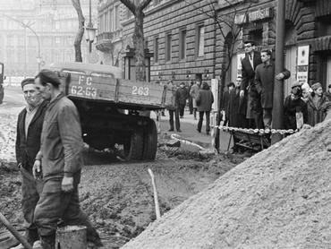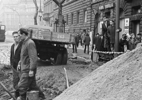 A következő képen a Teréz (Lenin) körút látható az Oktogon (November 7. tér) és a Király (Majakovszkij) utca között. A felvétel a Teréz körút 9. (Lenin körút 63.) előtt bekövetkezett vízfőnyomó-vezeték csőtörésekor, 1970. december 20-án készült.