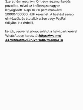 aki olvasónk "lenyűgöző önéletrajza" alapján kínál részmunkaidős pozíciót igen csábítónak tűnő feltételekkel. Ezután egy WhatsApp-linkre irányít, amelyen keresztül érdeklődés esetén fel kellene venni a kapcsolatot.