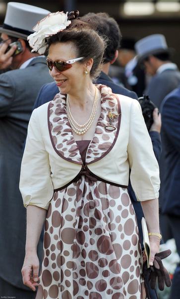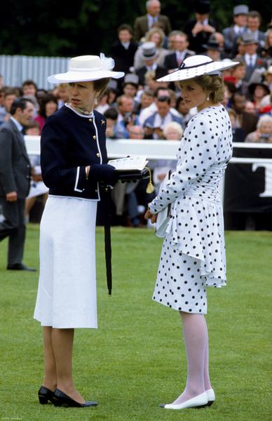Anna hercegnő és a Victor Edelstein féle pöttyös ruhát viselő Diana hercegnő az 1986-os epsomi derbin.