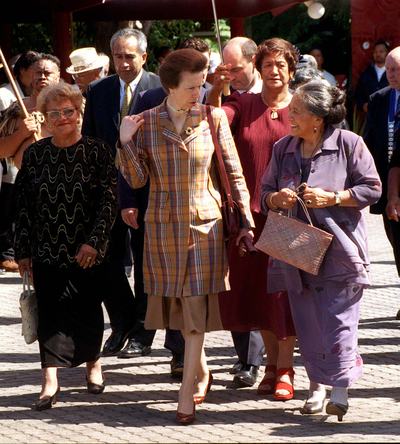 Kockás kosztümben sétált a maori királynővel Wellingtonban.