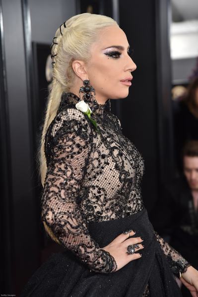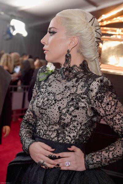 Lady Gaga 200 karátnyi fekete gyémántot visel, ebből fülbevalóként egy 18 karátos Lorraine Schwartz ékszert. De van ott még pár gyűrű is. A sok fekete gyémánt mellett azért még jól elfért a saját rózsaszín gyémánt eljegyzési gyűrűje is.