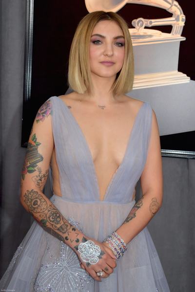 Julia Michaels újonc a Grammy-n. Egyik legötletesebb kiegészítője a lemosható fehér rózsatetoválás, mellyel a nők elleni erőszak miatti tiltakozását fejezi ki. Ezen kívül Chopard ékszereket visel: egy 72,92 karátos karkötőt 20,77 karátos gyémántgyöngyökkel és 4,51 karátnyi köralakú gyémántot, mely 18 karátos fehérarany foglaltban kapott helyet. Plusz két gyémánt gyűrűt.