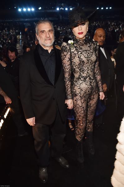 Itt pedig Gaga Joe Germanotta kezét szorongatja és időközben lecsatolta a fekete szoknyarészt a csipke Armani Privé kezeslábasról.