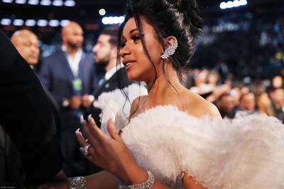 Cardi B az eléggé túlburjánzó Ashi Studio ruhája mellé még felkapott egy Messika Paris aszimmetrikus fülbevalót és egy gyémánt karperecet. Plusz 500.000 dollárt ér a 8 karátos gyémánt eljegyzési gyűrűje.