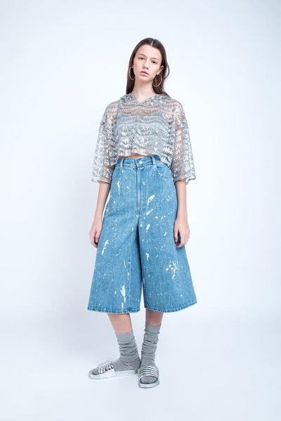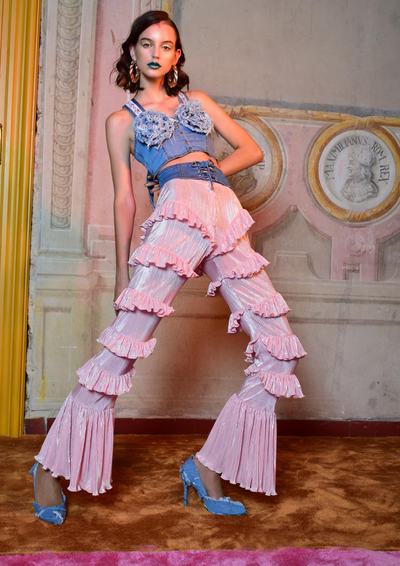 Gyárilag koszos bő farmergatya és áttetsző felső Tóth Tamara 2018-as tavaszi-nyári kollekciójában.