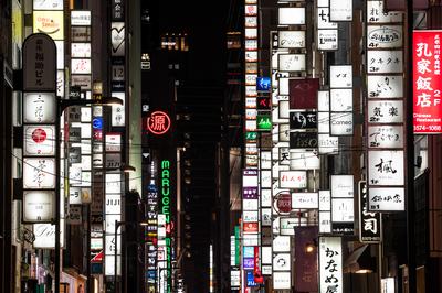 Étterem utca Minato városrészben, a sok tábla mind egy-egy éttermet jelöl, minden emeleten más és más helyekre lehet beülni enni valamit.