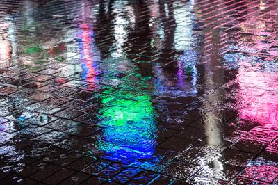 Esős aszfalt tükröződő neonfényekkel a shibuya kereszteződés mellett.