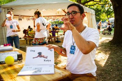 Igazából érdemes akár több órát is rászánni, mert rengeteget tanulhatsz nem csak a mozgássérültek játékairól vagy sportjairól, de önmagadról is. Például a jelnyelv alapjait is elsajátíthatod. Itt például a kutyát látod.