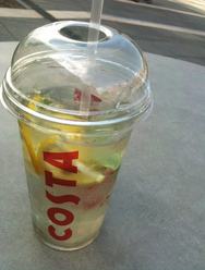 A Costa kávézóban rengeteg féle ital kapható, a jeges teáik egészen jók, épp ezért reménykedve tértem be ide egy limonádéra. Már az elején csalódtam, mert az amúgy széles választék a limonádékra nem terjed ki - szezonális termék, és mindössze egyféle kapható: bodzás. Nagyon divatos a bodza íz, mindenhol lehet kapni, nekem már egy kicsit sok is belőle. A műanyag pohárban lötyögő limonádé első ránézésre bíztató: van benne jég, citromkarika és még néhány mentalevél is. A pohár tapintása hűvős, ez jót ígér. Sajnos az ízteszt nem ennyire pozitív: a Costa bodzás limonádéja egy halovány bodzaszörp. Nem túl édes, nem túl savanyú, de még csak nem is túl bodzás. De legalább jó hideg.