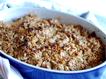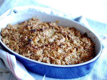 Egy másik tálban keverd össze a zabpelyhet, lisztet, cukrot, sót, majd szórd bele a felkockázott vajat és a kezeddel morzsold össze. A végén keverd bele a mandulát is, és kanalazd a morzsát a tök-gyümölcs keverék tetejére. 190 fokra előmelegített sütőben 20 perc alatt süsd készre. Akkor jó, ha a teteje megpirul, a gyümölcs levet ereszt, bugyog.