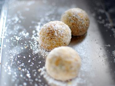 Formázz 2,5-3 cm átmérőjű golyókat a tésztából, tedd őket sütőlapra 160 fokra előmelegített sütőben süsd 15 percig, amíg a golyók alja egy kis színt kap. A sütőből kivéve pár percig pihentesd őket a sütőlapon, majd melegen hempergesd egy tálka sütőcukorba a sütiket. Szedd rácsra, hagyd teljesen kihűlni és ismételd meg a cukorban hempergetést. Dobozban 3-5 napig eláll.