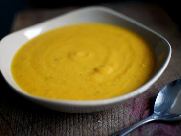 A leveshez fonnyaszd meg a durvára vágott hagymát vajon egy közepes lábosban. Keverd hozzá a római köményt, pirítsd egy percig, ügyelve arra, hogy a hagyma ne kapjon oda, majd tedd a lábosba a darabokra vágott megtisztított sárgarépát is.