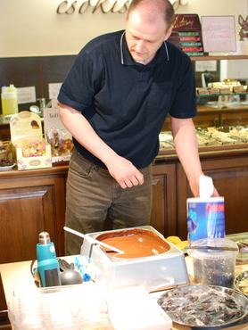 A bemutató egészen addig visszafogott hangulatban telik, amíg a mester a bonbonok testét - a tölteléket körbevevő roppanós csokoládékérget - készíti. Még akkor is nyugodt a társaság, amikor a bonbon talpát - a tölteléket lezáró alsó részt - önti. Innentől viszont az eddig elfojtott vágyak kiszabadulnak, mindenki szája csokis, a bátrabbak rumos aszalt szilvát mártanak az olvadt csokoládéba, a szerényebbek kandírozott gyümölccsel díszítik az elkészült bonbonokat. Közben mindenki a helyben készült macskanyelvet ropogtatja. Ilyen egy tökéletes vasárnap délelőtt.