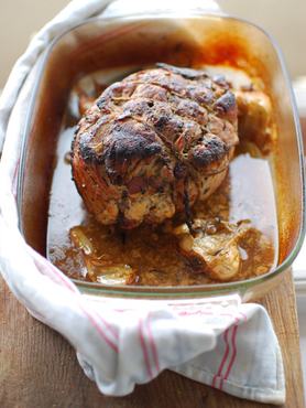A tepsit a benne maradt lével és sült darabkákkal tedd a tűzhelyre, öntsd bele a bort, és a húslevest, a leragadt darabokat kapard fel, majd az egészet forrald fel. Forrald tovább, kb. 5 percig, amíg kissé besűrűsödik - kb. fél liter mártást kell kapnod. Keverd hozzá a maradék fűszervajat, sózd, borsozd ízlés szerint. A szeletelt hús mellé tálald.