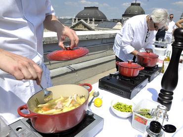 David Rathberger, a mindössze harmincöt éves francia Michelin-csillagos séf főzőbemutatót tartott a Sofitel tetején. Akit a főzés nem érdekelt, az se unatkozott, biztosan állíthatjuk, hogy a budapesti panoráma erről a pontjáról a legszebb városnak. Minket se annyira a séf, mint inkább a kultikus öntöttvas edény hozott lázba, amiben az ételek készültek. Gyorstalpaló wannabe Le Creuset tulajdonosoknak.
