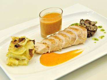 Porhanyós csirkemellfilé, formázott vadgomba raguval, házi burgonyalepénnyel, paprikás mártással, petrezselymes olajjal
