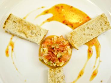 Bruschetta vagdalék: 4 db közepes tv paprikát kicsumázunk, majd félbevágunk, az erezetet eltávolítjuk. Vékony csíkokra felvágjuk, majd ezeket a csíkokat nagyon apró kockákra daraboljuk. 6 db közepes paradicsomot negyedekbe vágunk, kimagozunk, majd szintén apró kockára daraboljuk. Ehhez 2 gerezd fokhagymát, és 1 kiskanál finomra vágott lilahagymát adunk, az öntettel összedolgozzuk.