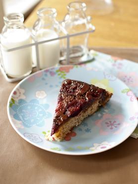A sütőből kivéve pihentesd a formában 15 percig, egy késsel lazítsd fel az oldalát, majd fordítsd egy tányérra, de hagyd rajta a formát 5 percig. Ezt követően óvatosan emeld le a tortaformát, így a karamellizálódott gyümölcs kerül a sütemény tetejére.