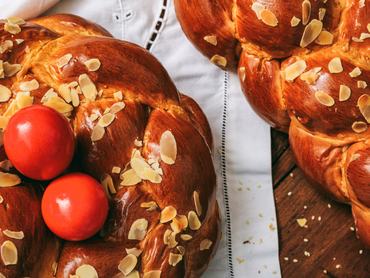 + Tipp: Készítsünk hímes tojásos kalácskoszorút! A már sütőformában lévő kalácsba nyomkodjunk félig, óvatosan tojásformájúra gyúrt alufóliadarabokat, és így süssük meg a kalácsot. Miután a kalács elkészült, helyettesítsük a fóliatojásokat igazi színes főtt tojásokkal. A tojásokat érdemes természetes anyagokkal színezni. A vöröshagyma + lila hagyma héjától piros, a csalánlevéltől vagy a spenóttól világoszöld, a kurkumától pedig sárga lesz a tojás. Annyi a dolgod, hogy a festőanyagokat felfőzöd ecetes vízben, a főtt tojásokat pedig ezekben áztatod egy éjszakán át.